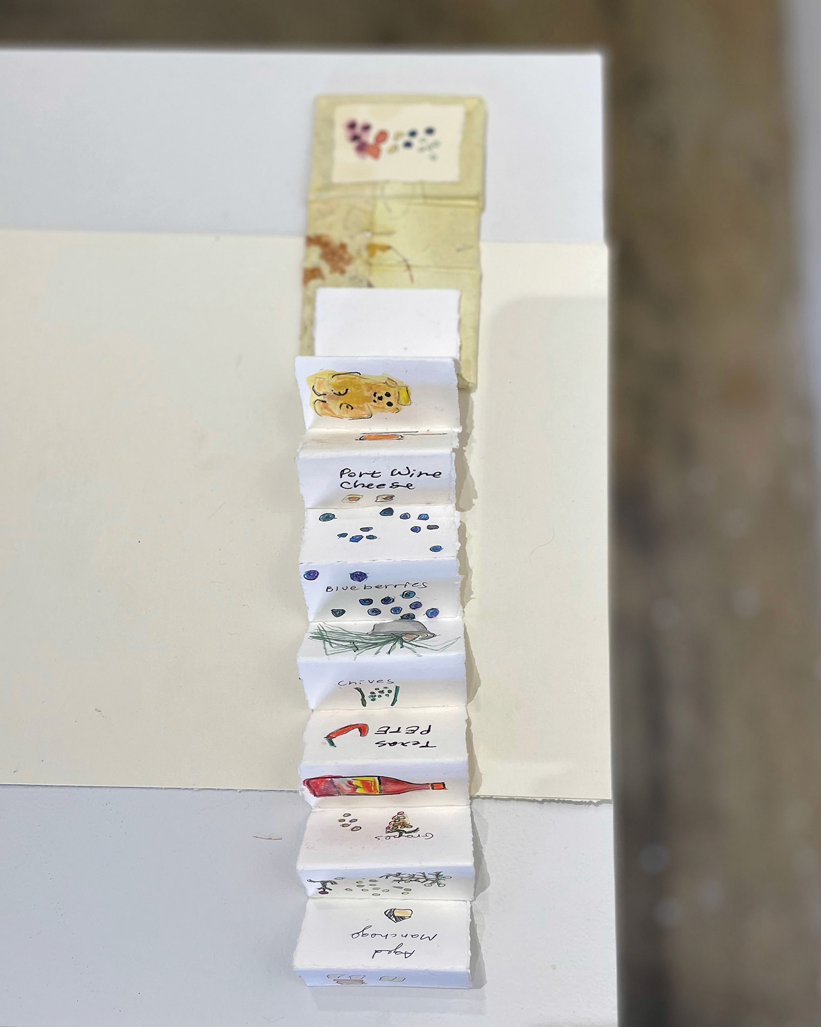 My partner likes to make cheeseboards, and I like to make handdrawn labels for the different food items. I decided to bind some in this accordion hardcover book.