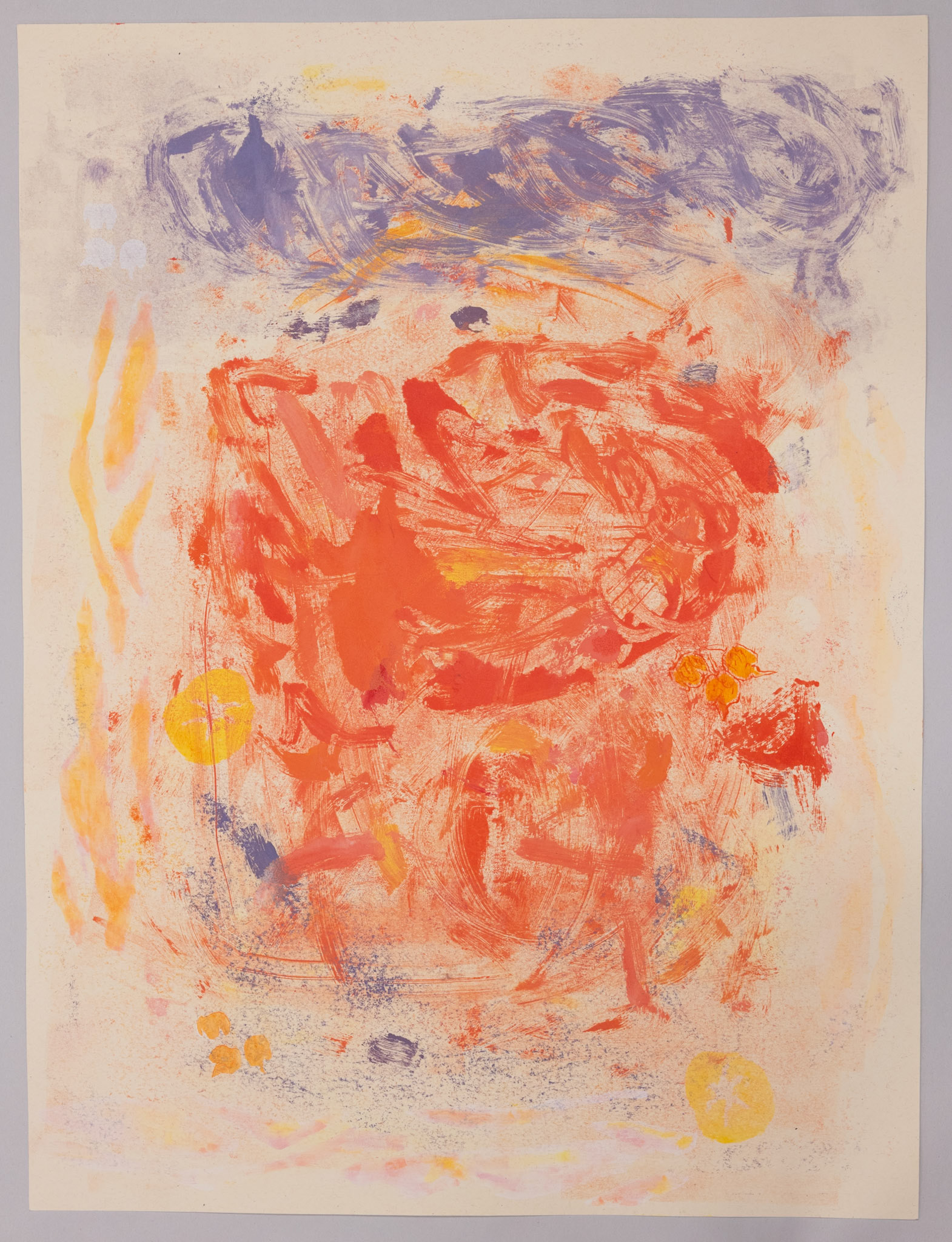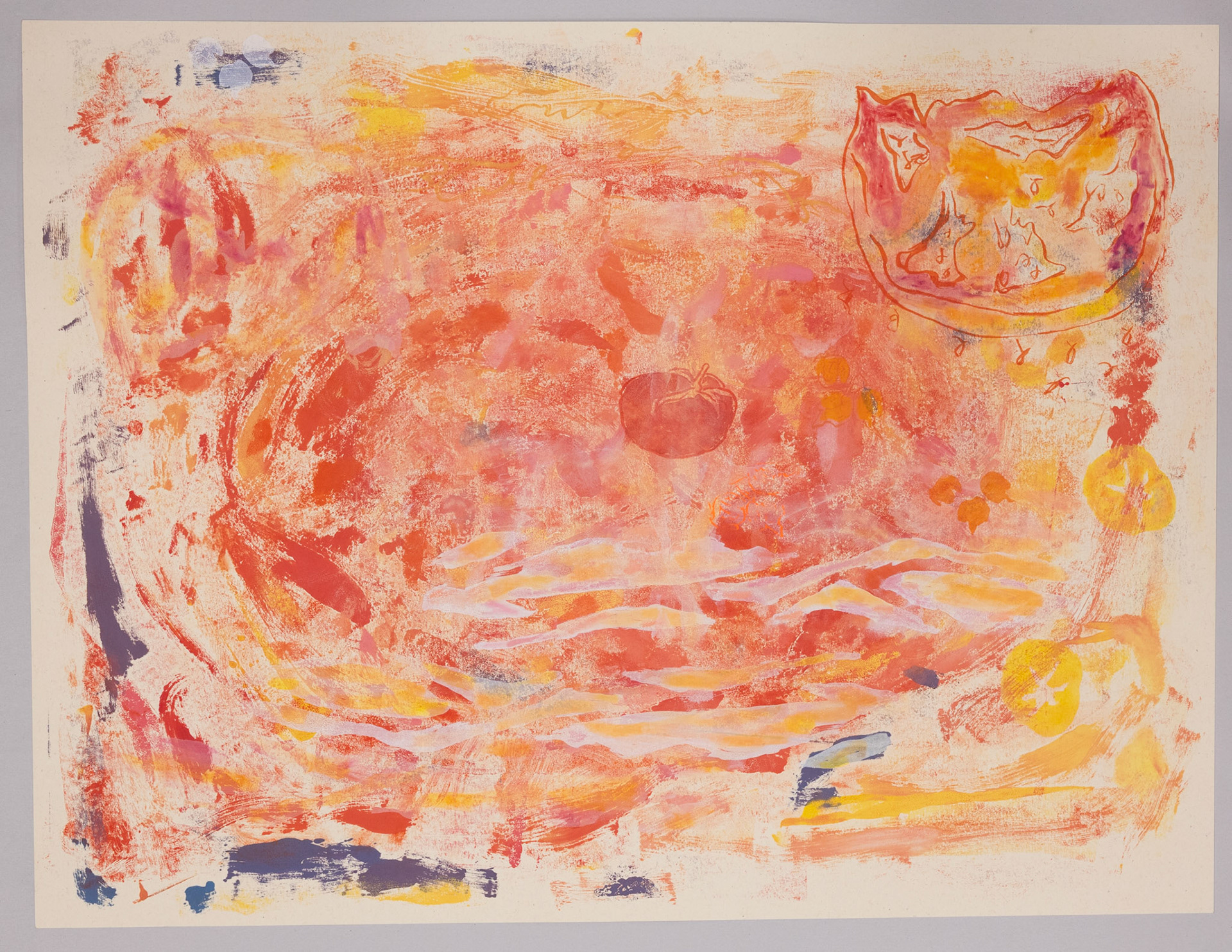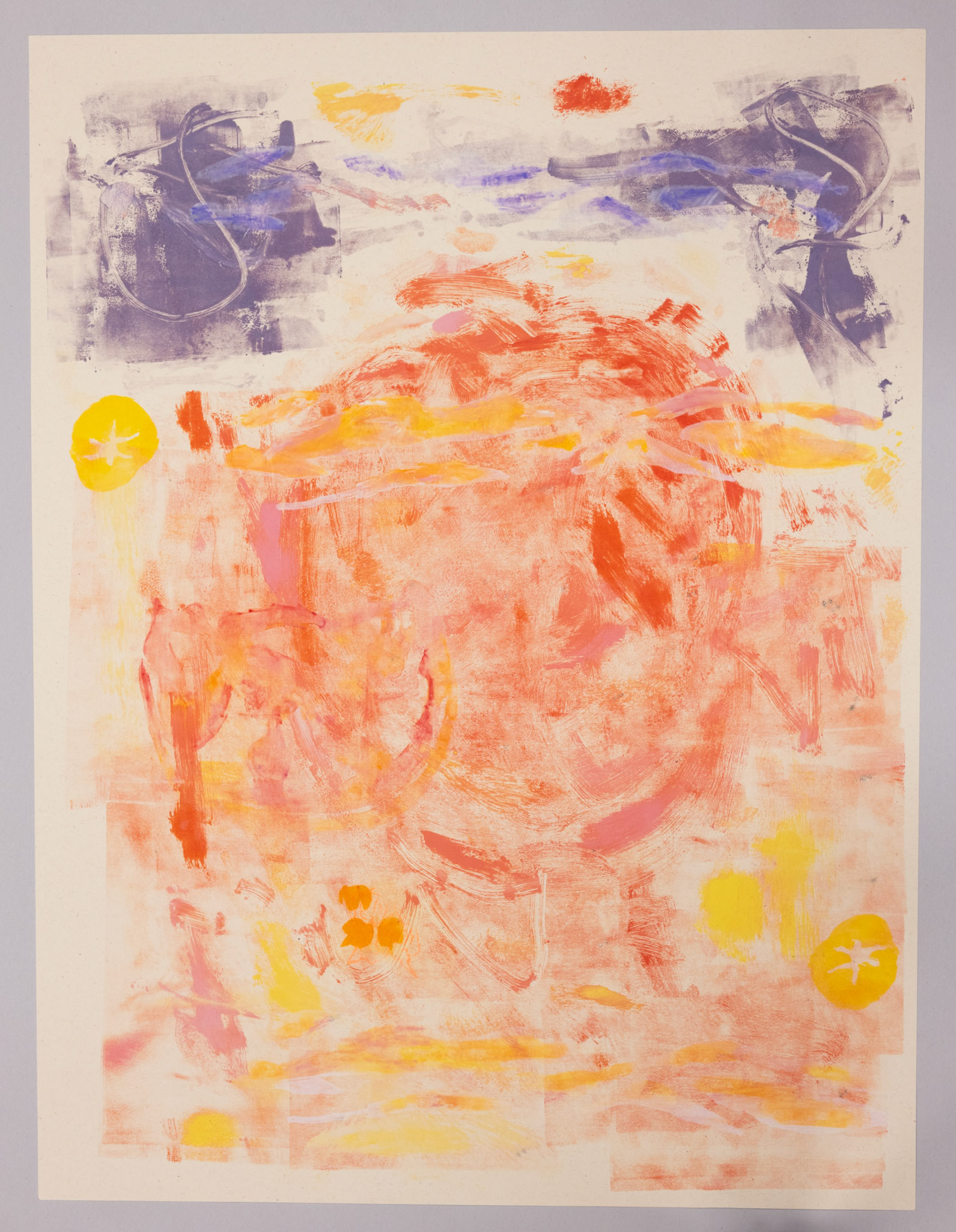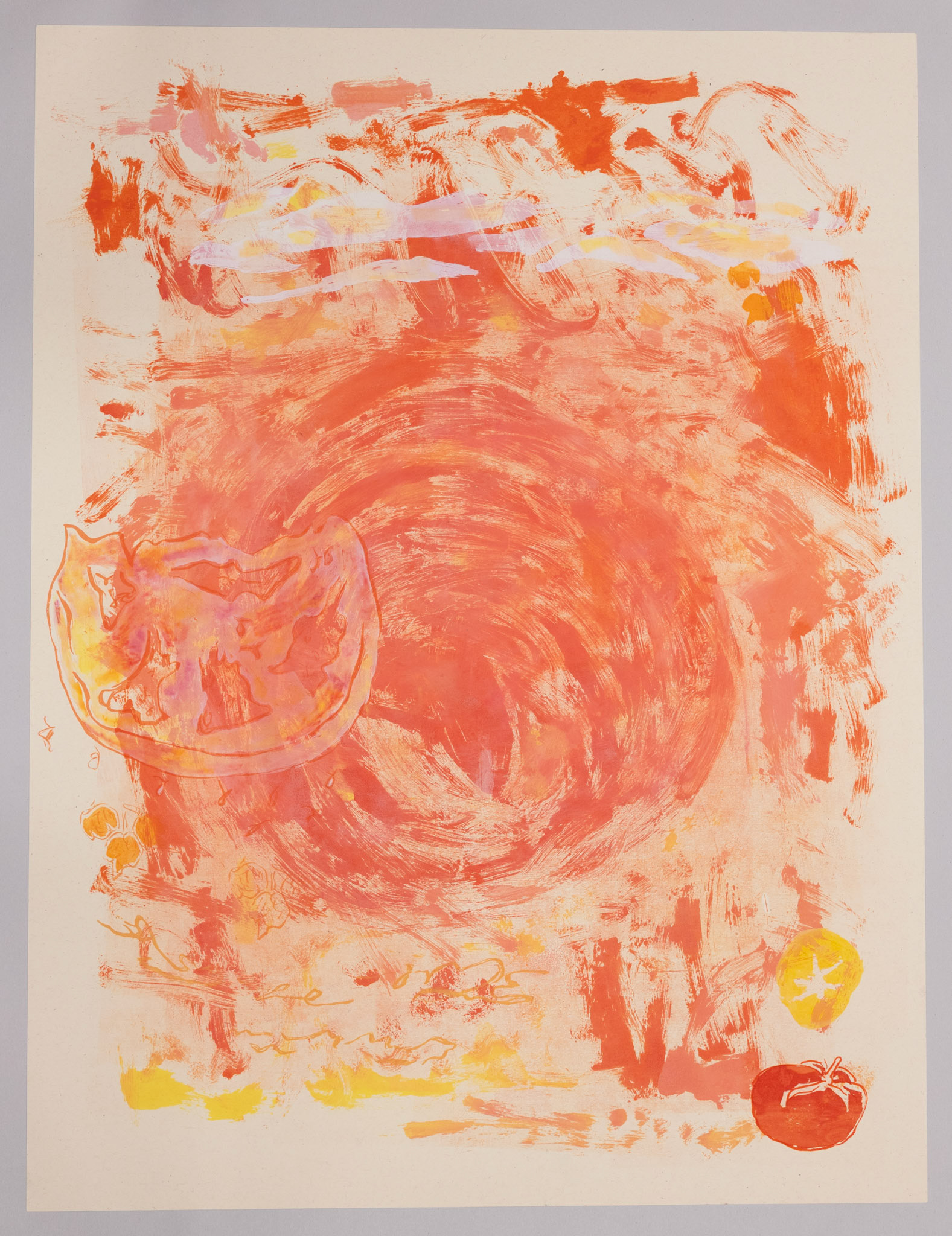 I made these monoprints during a residency at Kala Art Institute in 2024 while talking with my mom about old wives’ tales and her experiences growing up in Ashe County, North Carolina. I was raised in Raleigh, and I was interested in connecting her stories with my own through a landscape of North Carolina tomatoes. I printed monotypes as a base layer for each work using an etching press and inked plexiglas. I then screenprinted tomato, pepper, cloud, and mountain imagery on top of the painterly abstract marks using acrylic ink and water-soluble crayons.