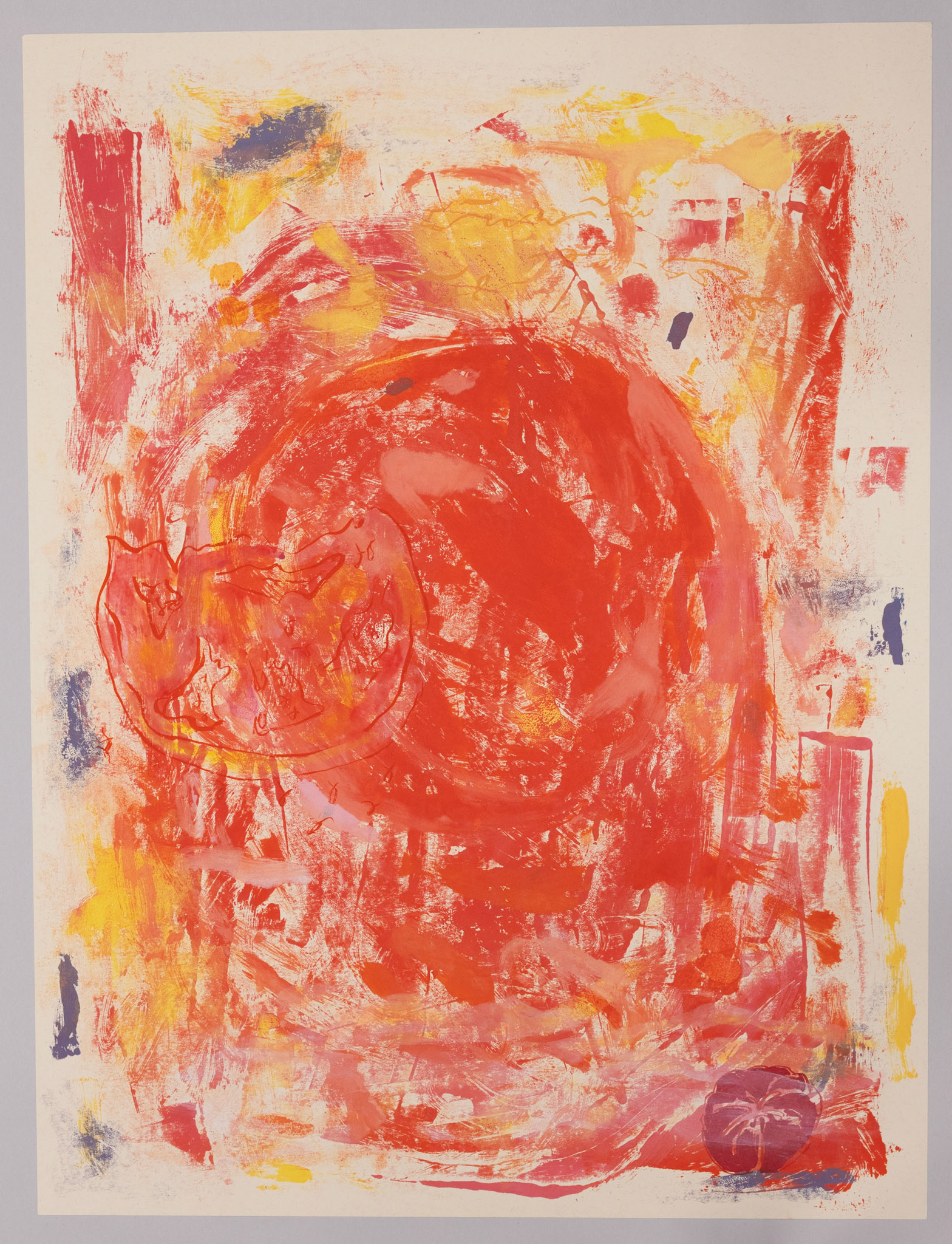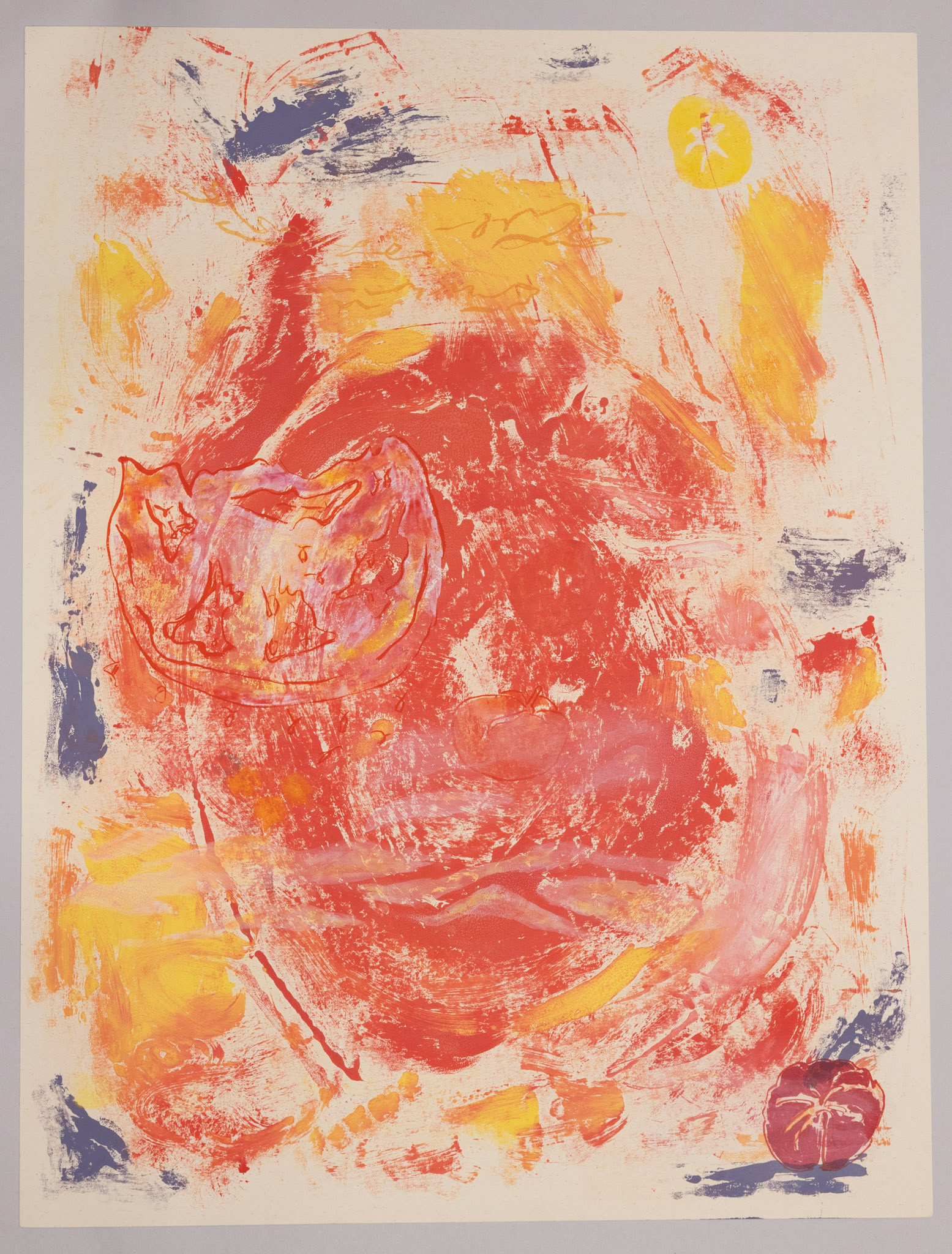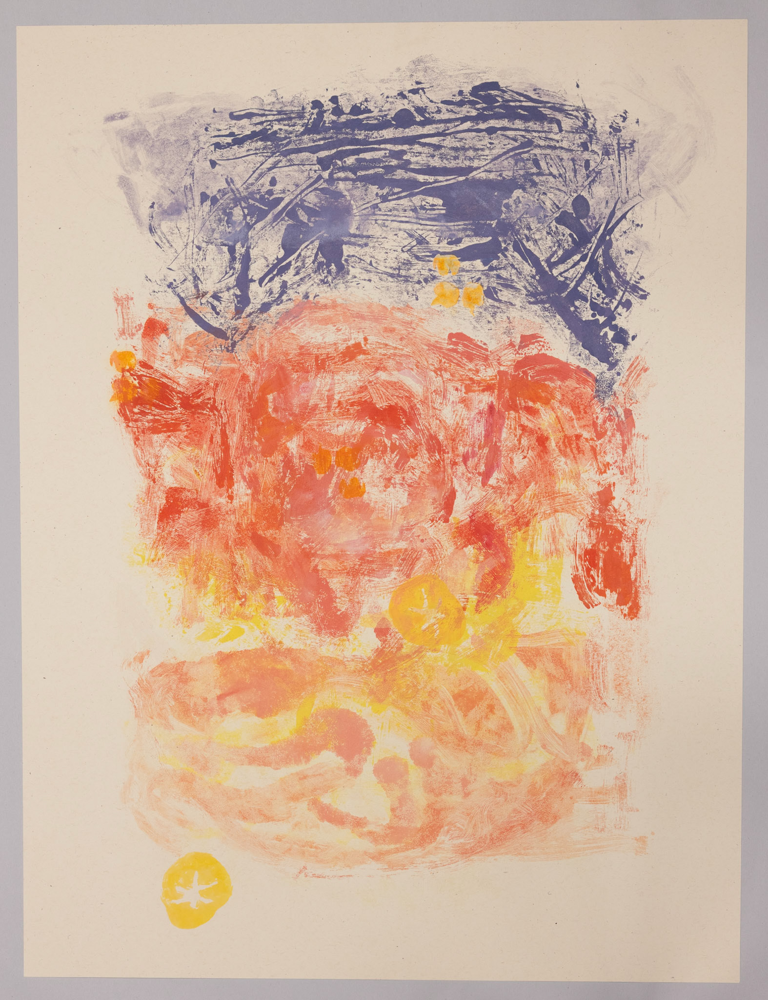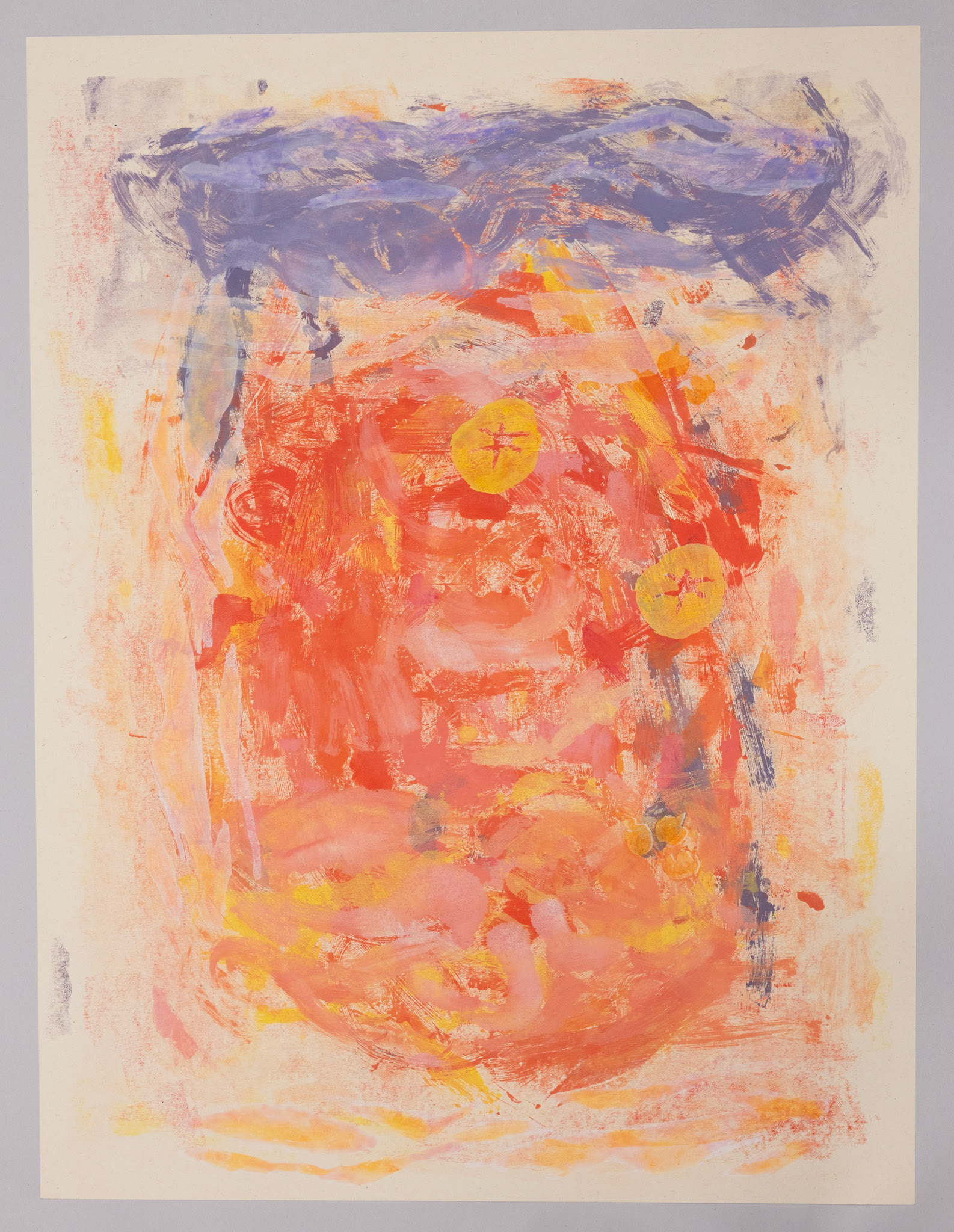 I made these monoprints during a residency at Kala Art Institute in 2024 while talking with my mom about old wives’ tales and her experiences growing up in Ashe County, North Carolina. I was raised in Raleigh, and I was interested in connecting her stories with my own through a landscape of North Carolina tomatoes. I printed monotypes as a base layer for each work using an etching press and inked plexiglas. I then screenprinted tomato, pepper, cloud, and mountain imagery on top of the painterly abstract marks using acrylic ink and water-soluble crayons.